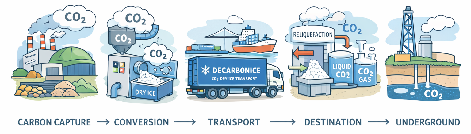 DecarbonICE provides safe, efficient, and scalable transport solutions for captured CO₂ in the form of dry ice. Our approach enables flexible and reliable carbon logistics, supporting the deployment of CCUS across industries and regions.